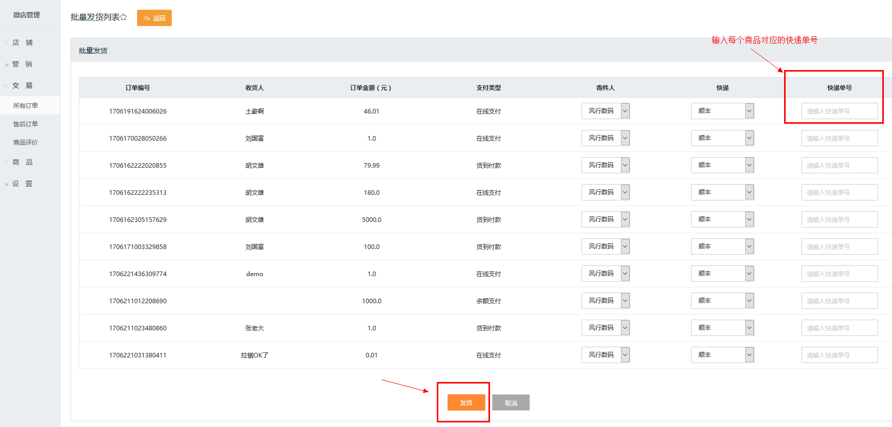 第三步 输入商品的快递单号,点击发货